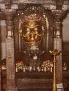 Special features of the lingam – a golden line divides this lingam into two unequal parts and is visible only in the light of reflected sunlight pointed at the lingam. The right portion of this lingam is said to represent Bhrama, Vishnu and Shiva – and the larger left part represents the Godess Kali, Lakshmi and Saraswathi. Adi Sankara the great religious leader had installed the metal image of the Goddess behind the lingam.
