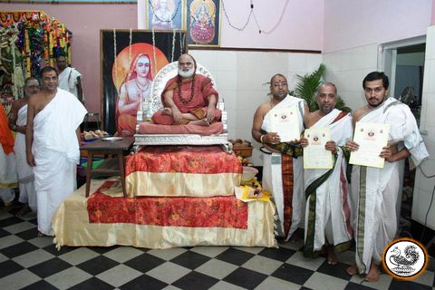 On 29th April, Shankara Jayanti day, the Jagadguru worshipped Sri Adi Shankaracharya in the afternoon and performed the grand ‘Kanakabhisheka’ to the idol therein. In the evening Sabha, the Jagadguru rendered an Anugraha Bhashanam highlighting Sri Shankaracharya’s unique contribution to Sanatana Dharma. The Jagadguru also released two books, entitled “Dharmattirkku Adhaaram Vedam” in Tamil, being a compilation of various benedictory discourses by the Jagadguru and “Atishaya Anubhavaamrita” in Kannada, being a compilation of the speeches and felicitations of Sri Abhinava Vidyatirtha Mahaswami and a Kannada translation of the book “Exalting Elucidations” published by Sri Vidyatirtha foundation on behalf of the Math, respectively. Vedic scholars were honoured while successful Vidyarthis were awarded certificates and shawls. Gold rings were awarded to Vedabrahmasri Chintapalli Anjaneya Ghanapathi of Hyderabad (Krishna Yajur Veda), Vedabrahmasri Ganesha Ghanapathi of Tirupati (Shukla Yajur Veda) and Vedabrahmasri Yogesha Manohar Borkar of Goa (Rig Veda).