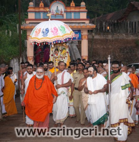 Ardrotsava took place on 5th January 2015 with the Mahamangalarati to Lord Malahanikareshwara and Goddess Bhavani being performed at around 5’O clock in the morning in the divine presence of Jagadguru Shankarcharya Sri Sri Bharati Tirtha Mahaswamiji. Devotees were present for the Mahamangalarati and the grand procession took place of the Utsava Murtis in the chill morning of the Dhanur Maasa. The procession of the Utsava Murtis of Lord Nataraja and Goddess Bhavani included three circumambulations of the hillock. The Jagadguru led the procession along the main streets of Sringeri till the municipality building. The function concluded with the Ashtavadhana Seva. The Utsavamurtis were then taken back to the Malahanikareshwara temple amidst chantings of Shivanandalahari composed by Sri Adi Shankaracharya. The previous night, Andhakasura Vadha was performed inside the precincts of the Peetham near the Pravachana Mandiram.